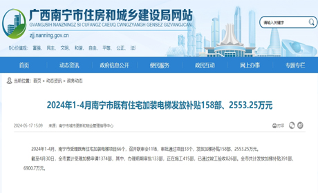 近日,,,,据南宁市住房和城乡建设局消息,,,2024年1到4月,,,,南宁市受理既有住宅加装电梯项目66个,,,召开联审会11场,,,审批通过项目33个,,,发放加梯补贴158部、、2553.25万元。。 截至4月30日,,全市累计受理加梯申请1374部,,,,其中,,,,办理前期审批133部,,,,正在施工415部,,,,已通过竣工验收826部。。。全市共计发放加梯补贴391部、、、、6900.7万元。。。。
